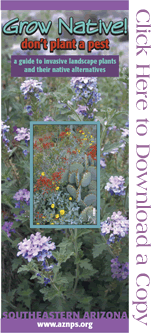 This website supplements the southeastern Arizona Grow Native: Don’t Plant a Pest pamphlet, which highlights native plant alterNATIVES to invasive non-native landscape plants. Click the image of the pamphlet's cover to download a copy of the brochure (1.4MB). Hardcopies of the brochure are available. A nominal fee will be charged to cover postage for bulk orders. Most plants that are brought into the region through the nursery trade do not become invasive or cause problems. In fact, the Arizona-Sonora Desert Museum estimates that only about 15-20% of introduced plants can actually survive in the wild. Yet some of these survivors can become aggressive invaders, crowding out native plants, changing natural ecosystem processes, and fueling unnatural fires. |
